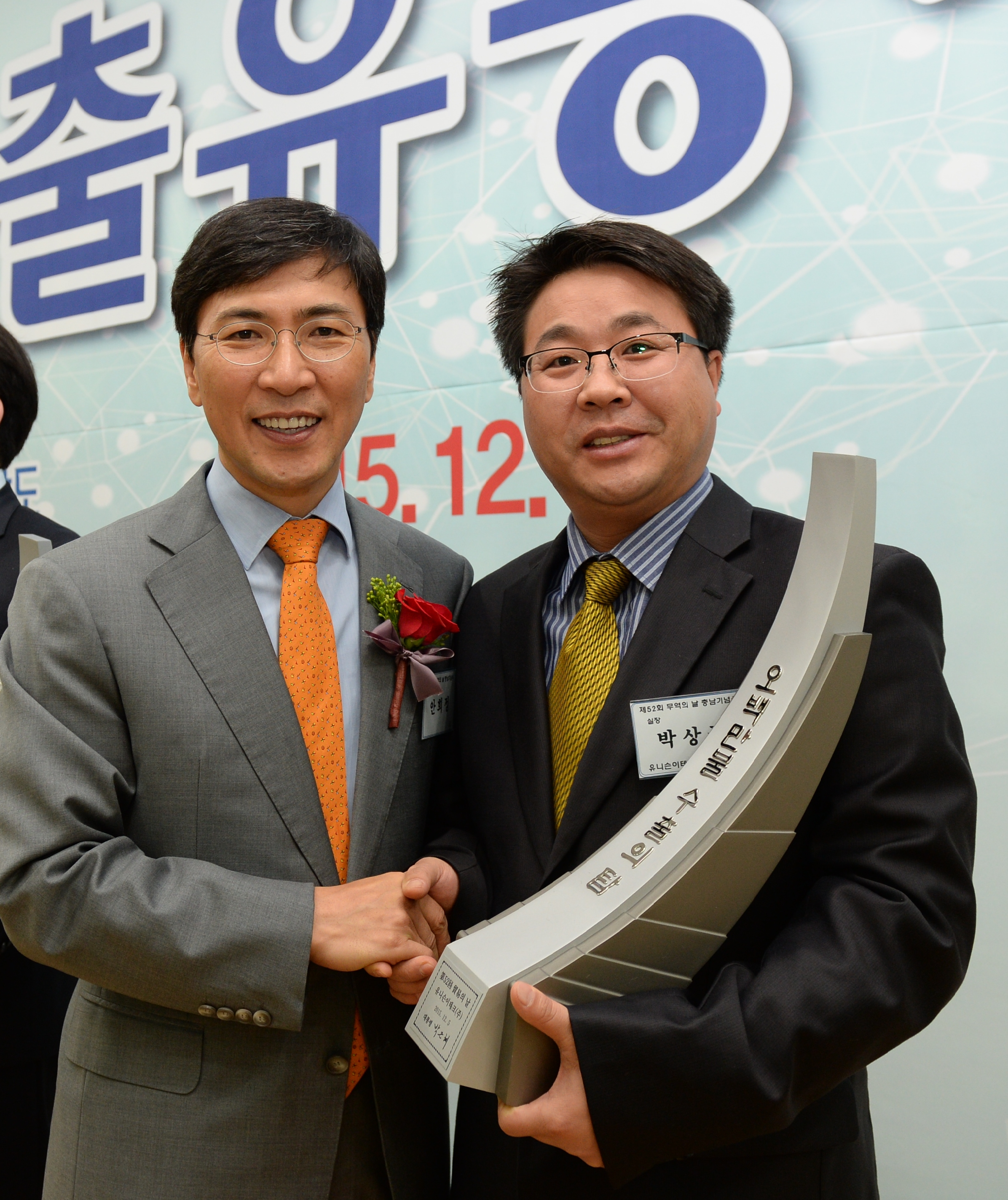 Mr. Ahn, The governor of Choongcheongnam-do, directly awarded to Mr. Park, The director of management in Unison eTech.In addition, we hope you to have a good time at the end of 2015.