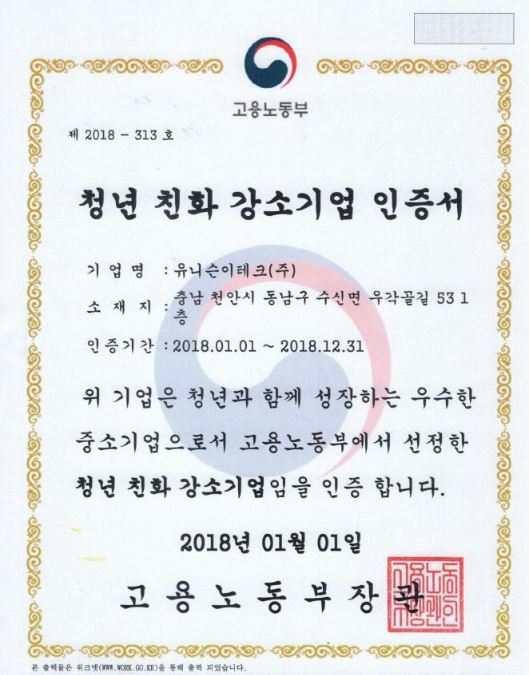공지2018년" 청년 친화 강소기업" 선정 등록일 : 2018.05.11조회수 : 6689 유니슨이테크가 고용노동부에서 선정한 "강소기업"으로 선정되었습니다. 강소기업으로 선정되기 위해서는 임금체불이 없고, 고용 유지율이 높으며, 산업재해율이 낮은 곳 등 다양한 요건을 충족해야합니다.그중 "청년 친화 강소기업"은 임금, 일- 생활균형, 고용안정이 우수하여 청년들이 근무하기 좋은 곳을 말합니다. 이전글 [언론/보도] 러시아 로사톰 (ROSATOM) 원전용 부품 공급자격 획득 2018.02.02 다음글 나이스 (NICE) 평가정보 면진·제진 기술평가 우수기업 인증 2018.05.24 목록보기