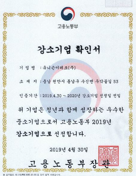 공지2019년 '청년 친화 강소기업' 선정 등록일 : 2019.05.27조회수 : 8202 유니슨이테크가 고용노동부에서 선정한 "강소기업"으로 선정되었습니다. 강소기업으로 선정되기 위해서는 임금체불이 없고, 고용 유지율이 높으며, 산업재해율이 낮은 곳 등 다양한 요건을 충족해야합니다.그중 "청년 친화 강소기업"은 임금, 일- 생활균형, 고용안정이 우수하여 청년들이 근무하기 좋은 곳을 말합니다. 이전글 2019년 두산 동반성장 협력사 선정 2019.05.20 다음글 합병공고 - 유니슨이테크(주) 2019.09.10 목록보기