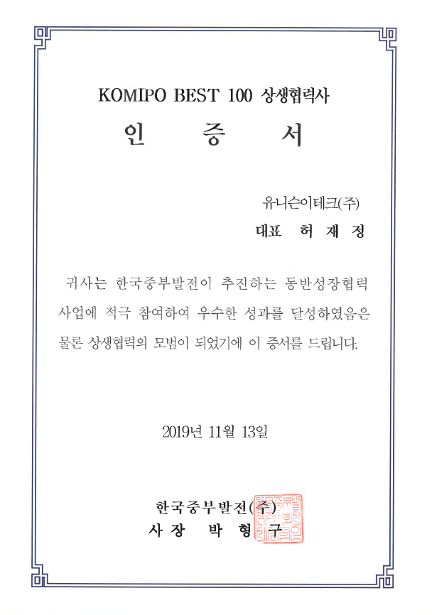 공지2019년 한국중부발전(주) KOMIPO BEST 상생협력사 선정 등록일 : 2019.11.14조회수 : 6529 당사는 2019년 한국중부발전(주) KOMPIPO BEST 100 상생협력사로 선정되었습니다.2008년부터 2026년까지 격년별로 10개사씩 총100개사를 선정ㆍ집중 육성하여 글로벌 강소기업화 하는 프로그램입니다. 이전글 [언론/보도] MBN 성공다큐 최고다 [2019.10.19] 2019.10.21 다음글 [언론/보도] [수요스페셜] ‘교량+플랜트+환경 ‘3각 편대’ 구축, 더 높이 飛上한다 [2019.11.13] 2019.11.15 목록보기
